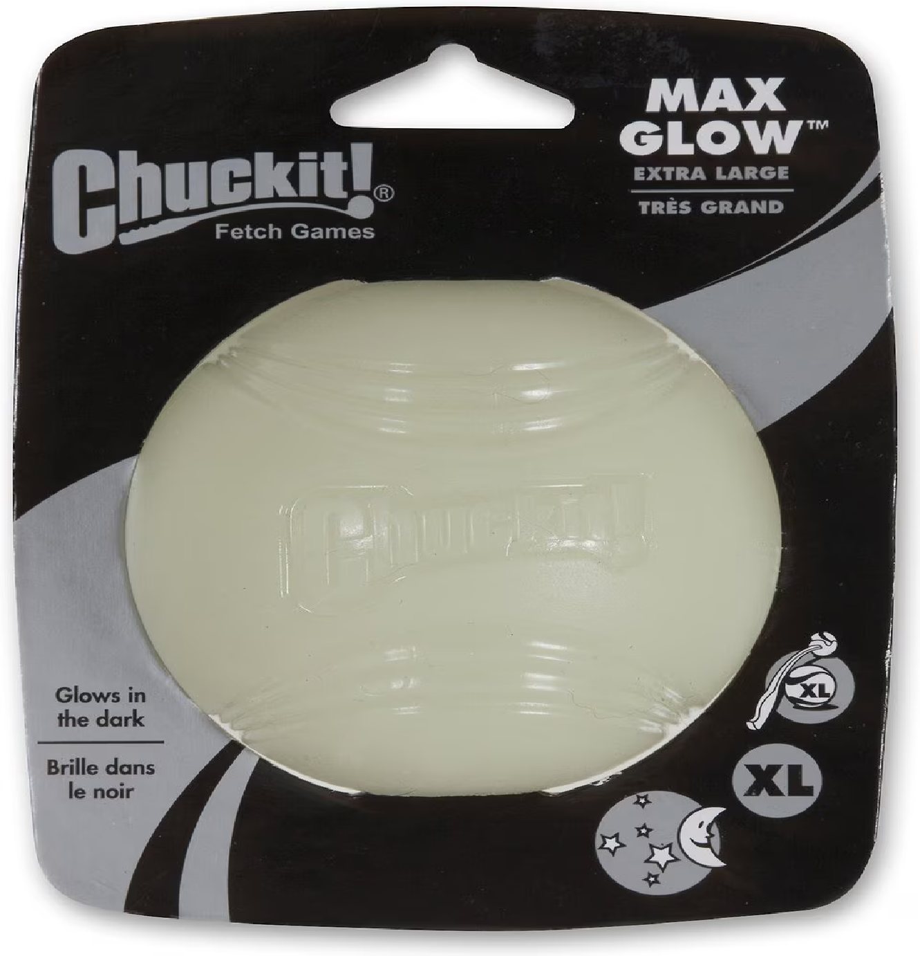 This is Shadow's favorite toy! This incredible ball glows in the dark and makes a whistling sound while it's flying in the air. Using the Chuck It! Pro Ball Launcher (below), this ball flies far and away, giving it time to bounce in front of the dog, reducing the choking hazard. It fits the standard ChuckIt Launcher of the same size. We use size XL. -